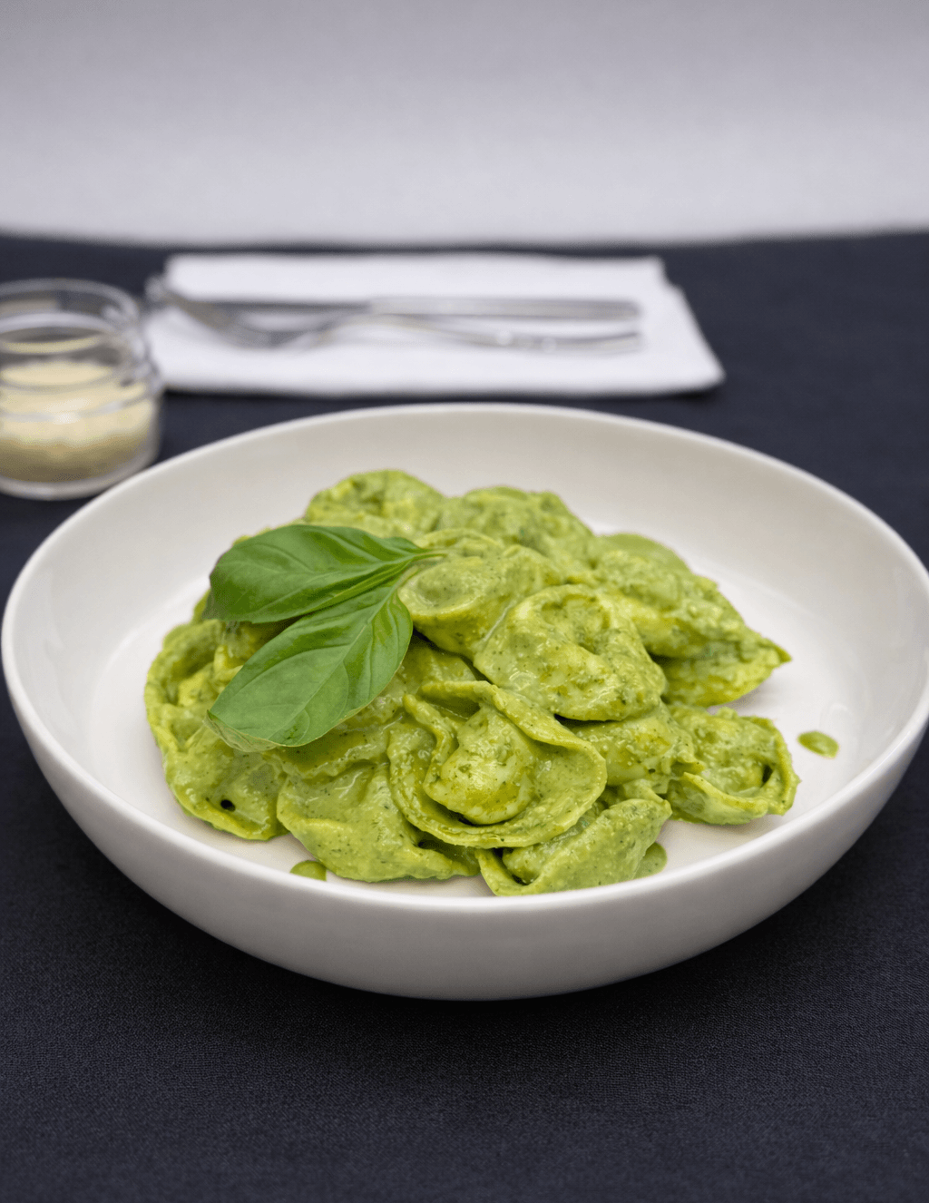Tender chicken inside carefully crafted triangles of homemade pasta- need we say more? Topped with a creamy basil pesto using a considered combination of almonds, basil, herbs and flat leaf parsley, this fresh, nutty dish takes a family favourite and elevates it.