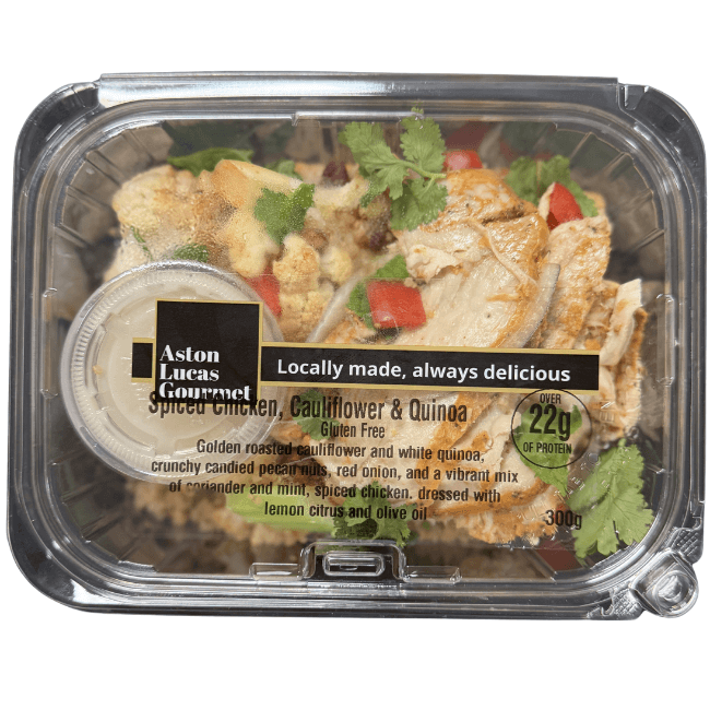 Cauliflower, Spiced Chicken (Rspca Chicken (92%) [Skinless Chicken Breast]. Spices, Dehydrated Vegetables, Sugar, Marinade Mix (Water, Starch Maize), Salt, Natural Flavors, Mineral Salts (451,450), Maltodextrin (Maize), Vegetable Gums (407a,415), Yeast Extract, And Nisin.), Lemon Dressing (Water, Vinegar, Canola Oil, Sugar Liquid, Salt, Lemon Juice Concentrate (3%), Garlic, Black Pepper, Thickener (Xanthan Gum).), Water, Celery, Quinoa, Roasted Red Capsicum (Sweet Red Peppers, Water, Vinegar,Salt Sugar), Pecan, Onion, Coriander, Mint, Maple Syrup, Cinnamon Ground, Salt.